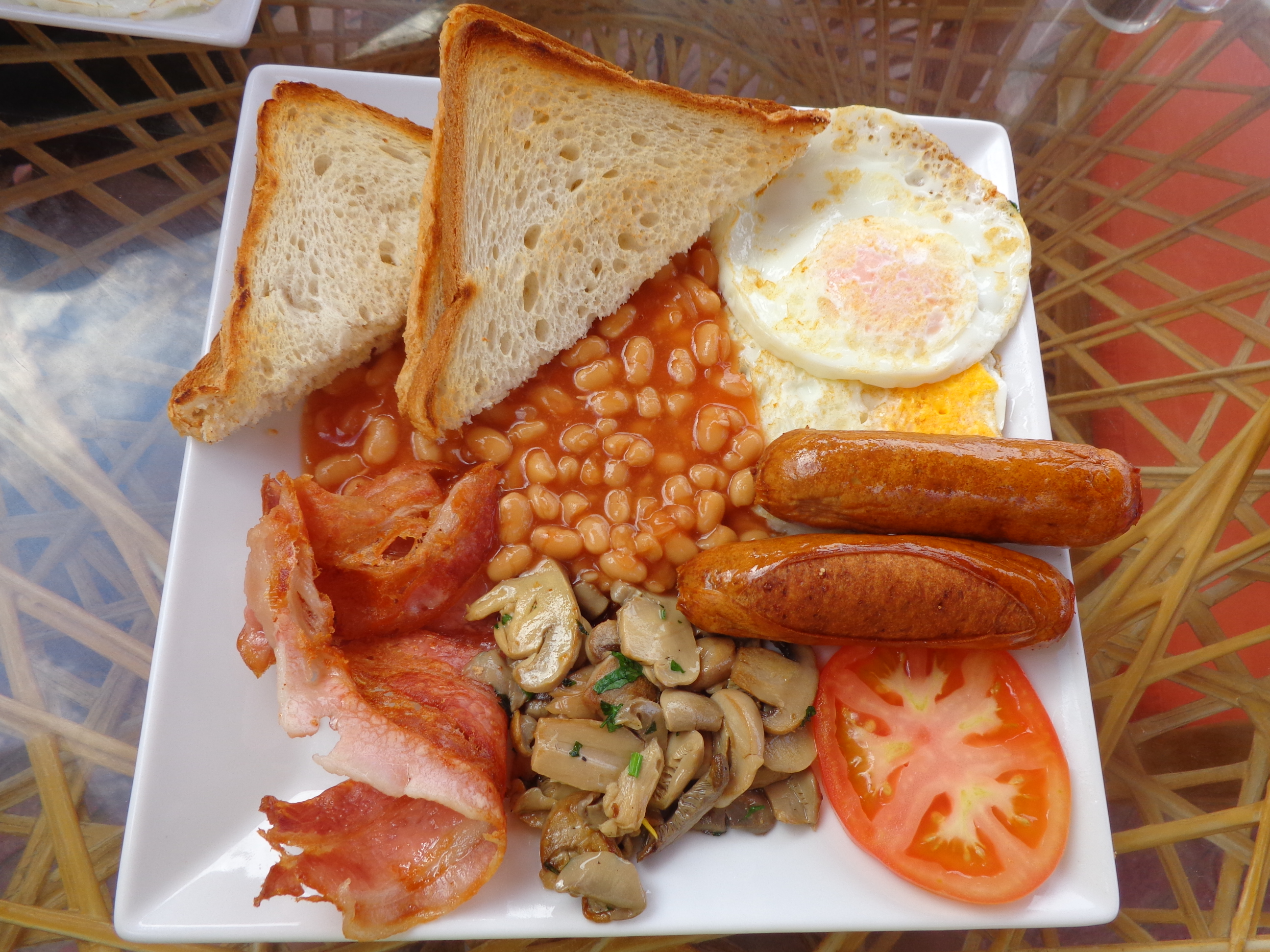 Having exchanged pleasantries with a couple but not pulling them in she came over to us and gave us the menu. They always do this even though they know we are here for the all-day-breakfast as it’s only 10:30 in the morning. She was gone then back outside in the sun where she spoke to guy on his own who was tall, plump and looked about 55, he was wearing a blue checked shirt and plain red shorts and a big smile. She then swept her arm vaguely at tables and asked him where he wanted to sit as in ; front, back, sunshine or shade. He chose to sit at the sunny table in front of us and ordered a beer. She looked up smiling and nodded at the rear of the restaurant so that within a few seconds a waitress who looked like she had dual Spanish/Oriental heritage appeared with a big smile and asked in accented but perfect English what he wanted. Gaffer returned to her pitch two or three meters onto the prom. The waitress having returned with his beer came to us and took our order for two full English breakfasts and one beer and one tea.