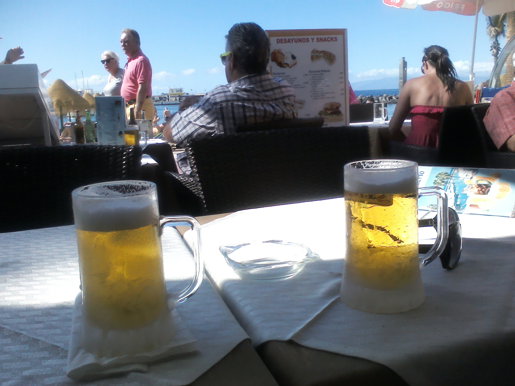 We have dined in the El Puerto before and enjoyed it, the food is good and the staff are really friendly. We looked around as we entered and chose a table where the chairs to the inside facing out were in the shade but the table itself was in full sunshine. It was a perfect position and a perfect view. We settled in and then watched while the Scottish gaffer, the person who pulls in the customers, did her routine of chat to prospective diners and drinkers: